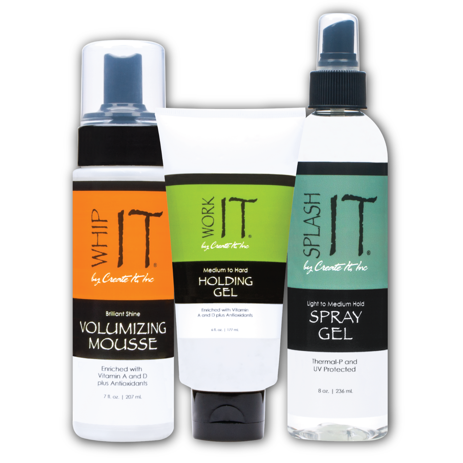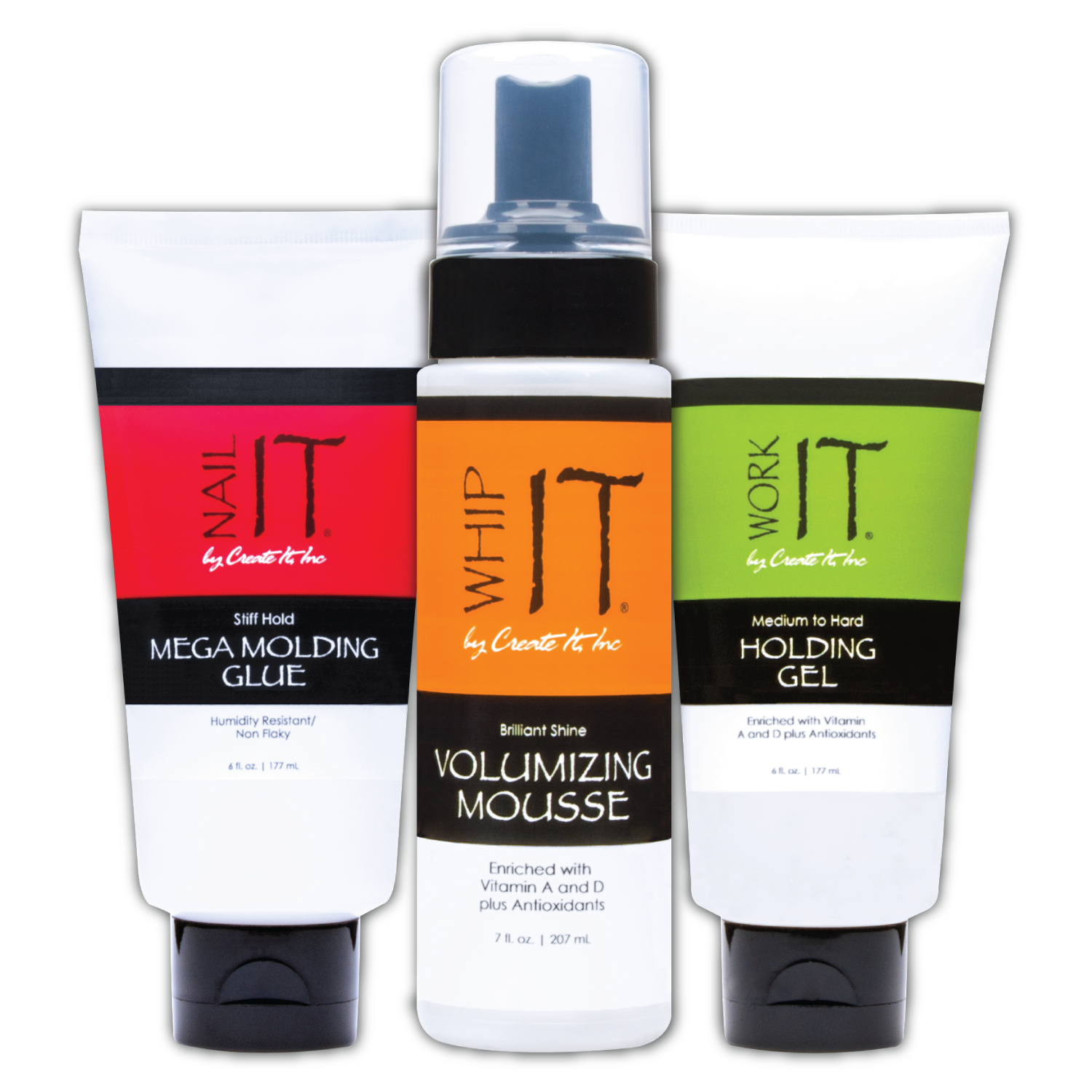 Whip IT, Work IT and Nail IT combine for a strong, voluminous hold. Gives well-defined hold for short to medium hair, or for long hair with round brushing.