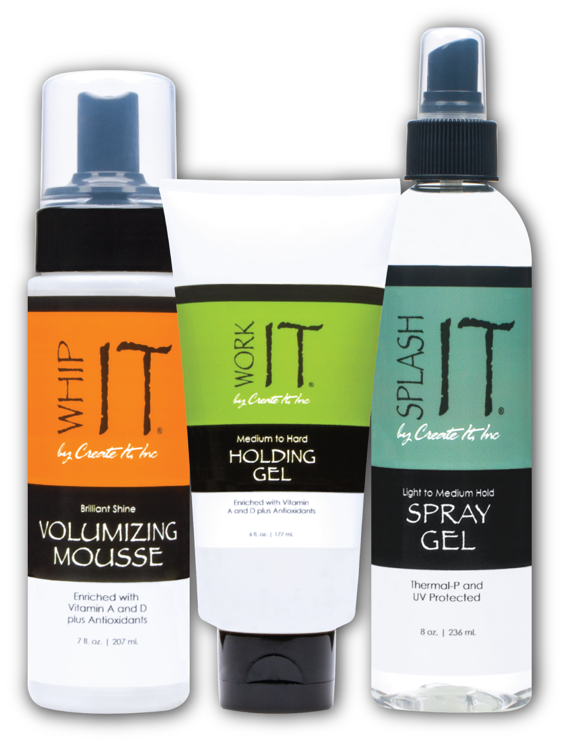 Whip IT, Work IT and Nail IT combine for a strong, voluminous hold. Gives well-defined hold for short to medium hair, or for long hair with round brushing.